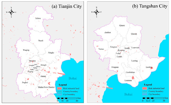 The distribution of the industrial land parcels with high human settlement risks in Tianjin and Tangshan City. (a) Tianjin City; (b) Tangshan City.