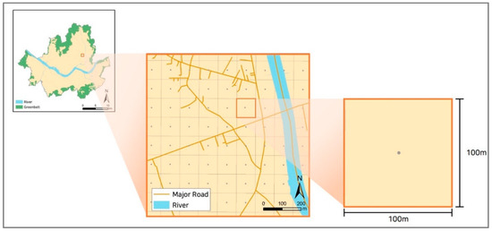 The target area includes all of Seoul, excluding rivers and greenbelt areas, from the city’s total area of 605 km2, 437 km2 was examined. There has been much discussion on the unit of neighborhood in the area of urban planning and design. Perry suggested a walking distance of a quarter-mile (400 m) as the radius of the neighborhood unit [42]. Several studies have taken Perry’s suggestion and used the 400 m radius, which is “5-min walking distance”, to measure the level of walkability [43,44,45]. Zhang et al. (2019) used a grid point with an interval of 150 m to measure the walkability of the Futian district in China. This is because a 150 m interval was utilized in the original Walk Score calculation method [46]. This study used a spatial unit that was equal to or smaller than 400 m, taking into account the previously used walking distance. Furthermore, taking into account the research of Zhang et al. (2019), which measured walkability similarly to this study, we utilized a grid point with a 150 m interval or smaller.