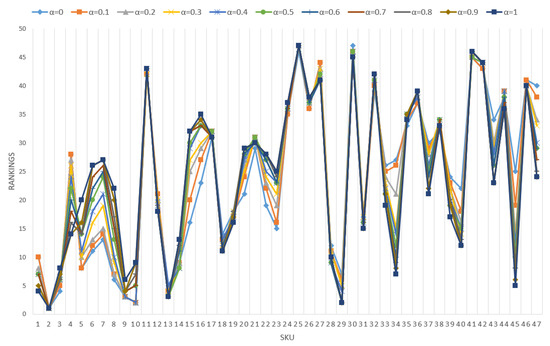 By means of incorporating the “coefficient of optimism”, , the pessimistic and optimistic outcomes are thereby balanced to mitigate the uncertainty in decision making. We ranked all SKUs based on different values of and report them in Table 3 and Figure 1.