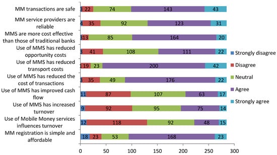 Figure 2 depicts the distributions of the responses of the respondents according to a 5-point Likert scale concerning their perceptions of mobile money and mobile money services. A significant majority (67%) of the respondents either agreed or strongly agreed that it was affordable and straightforward to register a mobile money account. A similar majority (65%) either agreed or strongly agreed that mobile money transactions were safe, while (54%) either agreed or strongly agreed that mobile money service providers were reliable. By contrast, the majority (130) either disagreed or strongly disagreed that using mobile money services to make and receive payments had significantly influenced the turnover of their businesses, while ninety-two respondents chose to record neutral responses, by comparison with a total of sixty-three who either agreed or strongly agreed with the statement. The perceptions of the respondents were significantly skewed towards either negative or neutral responses to the statement that their sales had increased after they had begun to make and receive payments by means of mobile money, as they accounted for 196 of 285 responses. The spread of responses to the statement that the adoption of mobile money services to make and receive payments had improved their cash flow was similar, although an even larger group of 107 recorded neutral responses. There was a significant consensus of 242 respondents who either agreed or strongly agreed that mobile money payments and receipts reduced transport costs, while 198 either agreed or strongly agreed that they reduced the cost of transactions. A further 133 either agreed or strongly agreed that they reduced opportunity costs, while 184 either agreed or strongly agreed that they were more cost-effective than the services of banks.