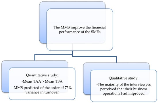 The triangulation process helps to confirm the interpretations which researchers have made of their data [62,64]. The findings which were obtained from the personal interviews in the qualitative study were used to validate those which emerged from the administration of the survey questionnaire in the quantitative study. Figure 4 is a schematic representation of the procedures which the researcher followed to triangulate the main findings from both phases. From the results, it can be concluded that the mobile money payment and receipt services have impacted on the financial performance of the SMEs in Douala, Cameroon after they had begun to use the platform.