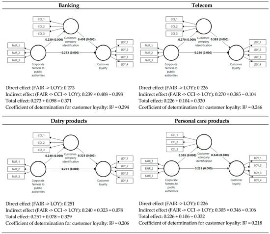 Considering the coefficients of determination (R2) for our target dependent variable, it can be stated that between 20% and 30% of the variation in customer loyalty is explained by customers’ perceptions of corporate fairness to public authorities (including the mediating impact of customer-company identification). Still, a larger R2 can be observed in the service sectors (banking: R2 = 0.294; telecom: R2 = 0.246), as compared to the products related sectors (dairy products: R2 = 0.206; personal care products: R2 = 0.218). This can be explained by considering the particularities of banking and telecom sectors. Firstly, in these cases the players are few and large-sized, registering important earnings, so people expect and monitor them to a larger extent with respect to their relationship with the government. Secondly, both the banking and telecom sectors are heavily regulated, their compliance with laws and regulations are, to a larger extent, a subject of interest for both their customers and the media. Thirdly, especially in Romania (where the research sample originates from), customers pay more attention to the banking sector as compared to other industries when it comes to corporate ethical behavior, as the sector has been involved in scandals concerning abusive contractual terms and fraudulent practices for many years.