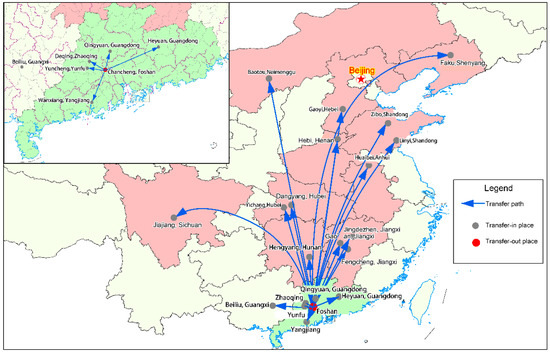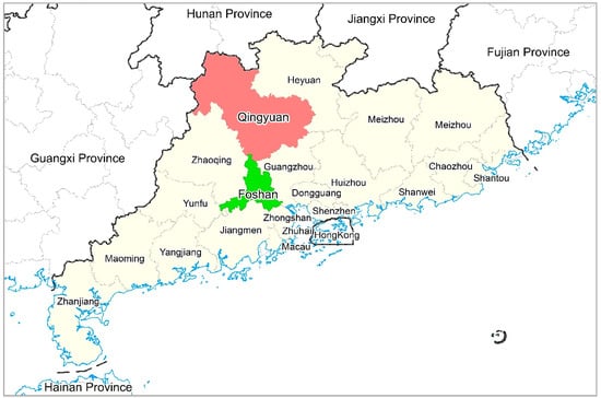 Located in south China, Guangdong is one of the most developed provinces in China. It has been continually ranked No. 1 in GDP among China’s provinces since 1989. Since 1978, a lot of foreign businessmen—those mainly engaged in Hong Kong’s labor-intensive manufacturing industry—marched into the PRD of Guangdong Province. It also heavily promoted the economic development of PRD city groups, giving the well-known area the nickname of “the factory of the world”. The “Front Shop, Back Factory” industrial division pattern among PRD, Hong Kong, and Taiwan was formed at the end of the 20th century. Meanwhile, the economic gap between PRD and the peripheral NPRD was expanding quickly. The PRD, comprising 20% of the population and 14% of the area of the entire province, constituted 80% of the overall economy of the province. This is the core–periphery gradient, with the core PRD being the developed region and the peripheral NPRD as the developing region [3]. This paper chose Foshan City (the industry transfer-out place in the PRD) and Qingyuan City (the industry transfer-in place in the NPRD) as the case study area (Figure 2).