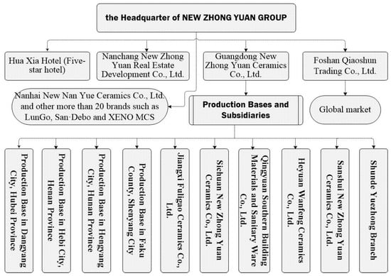 Because there are still open spaces in domestic and international markets for the development of the ceramics industry—especially for middle-grade and high-grade ceramic industries at present—large-sized manufactures with certain competitiveness have a chance to thrive. After accumulating basic amounts of capital, they can first execute “voluntary and dispersive” expansion investment. Next, they can establish development bases on a national scale, including branches, production bases or centers of exhibition, and sales bases, for the purpose of further expanding enterprise scale, reducing production cost, improving market competitiveness, and executing cross-regional development strategy. They retained the headquarters, research and development base, and partial high-end production links in the origin, and they finally attained the multiplant, multilocational production spatial organization form. Through the interview to headquarters in Foshan and branch factories in Qingyuan of some enterprises, it is evident that trans-regional expansion and the change of production organization of NEW ZHONG YUAN CERAMICS GROUP is a typical case of a multiplant, multilocational production spatial organization (e.g., Table 4). NEW ZHONG YUAN has built a complex network spatial pattern of multilocational management, production and marketing composed of 10 productions bases in South China, Central China, East China, Southwest China, Northeast China and North China, and more than 1000 sales networks and foreign marketing networks in more than 120 countries and regions. It has claimed the largest global production scale and export volume of modern production and sales enterprises of the Chinese ceramics industry in history. The hierarchy, functional division, and grouping network structure has gradually appeared all over the country; headquarters, subsidiaries, production base networks, and marketing networks are shown in Figure 4.