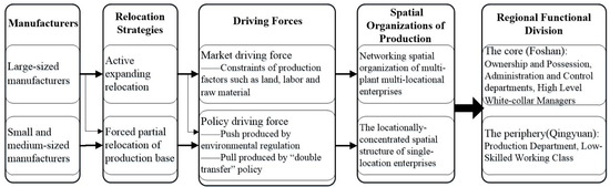 The location selection mechanism and effect of industrial transfer have been widely considered in academia, but the influence of institutional factors on cross-regional industrial transfer and regional differences still need further investigation. Based on theories of economic geography as well as new economic geography (NEG) and its’ institutional transformation, this paper studies the form, mechanism, and effect of the “core–periphery” regional relationship between the Pearl River Delta (PRD) and non-Pearl River Delta (NPRD) areas in Guangdong Province from the micro perspective of industrial spatial organization. Based on a case study on the change of the cross-regional production spatial organization of ceramics enterprises between Foshan and Qingyuan, it is found that after three rounds of spatial reorganization, the production spatial organization of Foshan’s and Qingyuan’s ceramics industries has changed significantly, forming a multifactory, multilocation production spatial structure and regional production network, which further drives to form the regional functional division of “core–periphery”. Institution factors, especially environmental regulation and industrial transfer institutional arrangements, have become an important driving force for the current industrial transfer, but its impact on regional relations is still not a decisive factor. The path locking of the “core–periphery” mode has not been fundamentally broken through. Although the form of spatial inequality has greatly changed, in fact, it produces a new form of inequality. The economic, geographical, and political theoretical framework from the micro-perspective of enterprises will provide a possible theoretical explanation for the phenomenon of “pollution moving to the West, high-tech industry moving to the East, industrial output gathering to the East” in China.