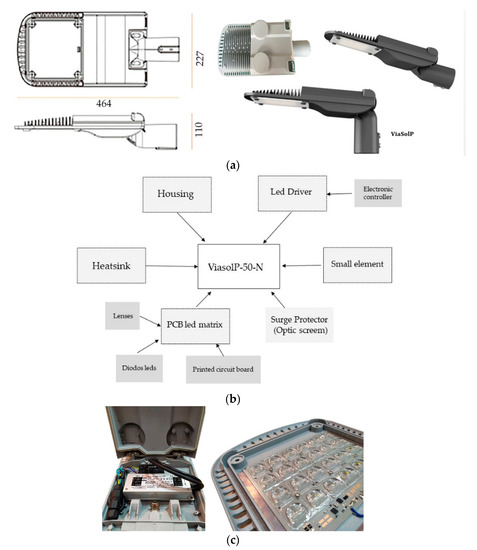 LED Streetlight luminaire, Family: ViaSolP. (a) General view and dimensions. (b) Outside diagram. With different parts of luminaries. (c) Image of PCB with electric elements (LED-Driver) and a LED-matrix with image of lenses (Source: SOLITEC).