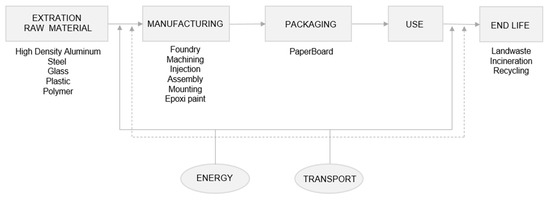 The functional unit of the LCA can be determined based on the quantity and quality of the light depending on a period of use of the same. This is important in the case of performing comparative LCAs between different luminaires, since it can significantly affect the results, especially if variable criteria are used for each luminaire [49]. In our case, we use the useful life to facilitate data collection in the inventory, as explained in the previous paragraph.