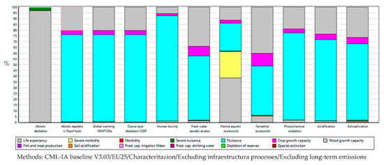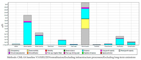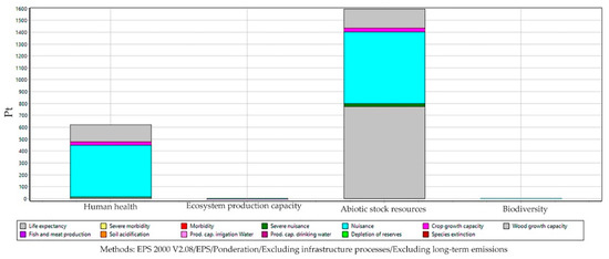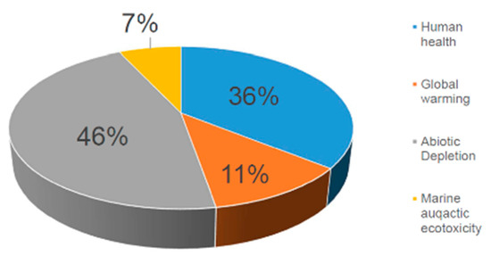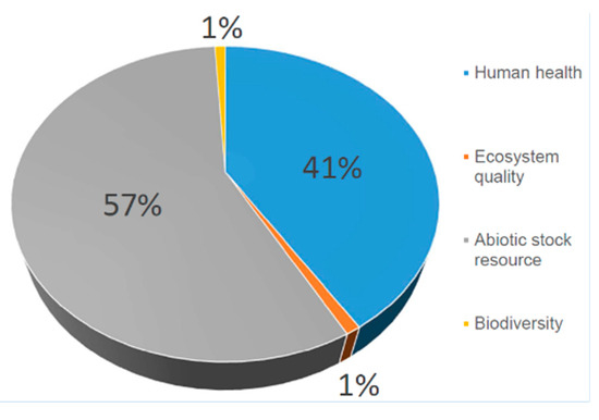 The categories of impact are identified from the following issues: production capacity of the ecosystem (including information relating to agriculture, fish or meat, and the decrease in timber field), protection of human health (including human diseases), natural resources and abiotic resource in stock, with the environmental cost, resources, and biodiversity (including the extinction of species) [59,60].