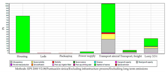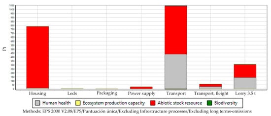 Through the single score we can determine the kPt value for the LED street lighting equipment, in factory processes where the greatest impact is found [32]. The transport by plane to the assembly plant in Spain is the one that has the greatest impact, being up to 72% greater than with respect to the rest of means. In addition, road transport is added by truck or van for last mille and end-product distribution. This fundamentally affects human health. On the other hand, the manufacture of the housing (heatsink) in the factory, generates an important impact on the reduction of abiotic resources. The rest of the impact are of little relevance. Figure 5 illustrates more in detail the information on those impact categories that are most affected. Adding the impacts produced both in the manufacturing processes and in the transport of the housing and the other hand, power supply, it results in 87% of impacts on the reduction of reserves, and 13% on the life expectancy. In this study, the packaging has a lower relative impact than other processes.