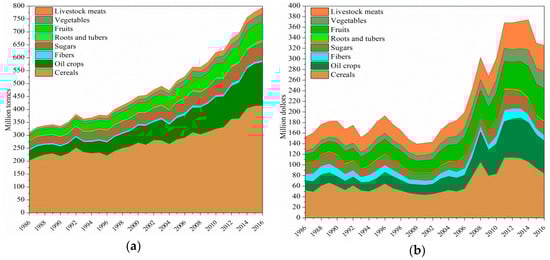 Changes in the general export strength of agricultural products during 1986–2016 showed that, in terms of physical volume (Figure 1a), the total export of agricultural products increased gradually by 2.55 times during 1986–2016, from 311 million to 794 million tonnes, indicating the expanding of the global trade scale (Figure 1a). In terms of value volume, total export also increased but with fluctuation (Figure 1b). It grew especially rapidly after 2005, with the maximal value of $337 billion in 2014. This illustrates that an increase in export volume of agricultural products did not indicate an increase in monetary value. The main reason for this was the great variation in prices of agricultural products in different years. Over the past century, gross food prices have generally fallen, and were especially affected in 1997 by the financial crisis in Asia—the value of international agricultural products traded during 1998–2002 declined to its lowest interval in 30 years, in marked contrast to the steady increase in physical volume (Figure 1a). In mid-2008, there was a rapid rise in food prices induced by the droughts in Russia, Ukraine, and the US in 2007, the increase demand for agrofuels, and other reasons [,,], resulting in rapid growth of gross trade value (Figure 1b).