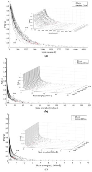 Figure 2 shows the cumulative distribution of node degree and node strength probability during 1986–2016; both cumulative node degree (links) and node strength followed power–law distribution, with the cumulative distribution of node strength showing larger curvature. There were many nodes with relatively small degree and strength and only a few nodes with larger degree and strength in the agricultural network, which indicated that both the number of trade partners and trade volume of each nation in the global agricultural trade network were highly heterogeneous. Weighting of the network increased its heterogeneity.