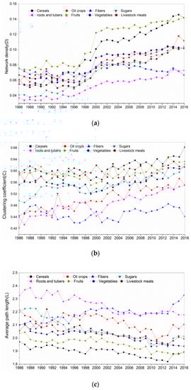The network densities of eight groups of agricultural products were calculated using Equation (4), which showed the network density (D) values of seven groups (apart from fiber) rising, and especially quickly after 1998 (Figure 3a). This indicates closer relationships developing between economies participating in global trade. Meanwhile, differences in D values among the eight groups widened during 1986–2016. By 2016, cereals and fruits had the highest network density, and roots and tubers and fibers had the lowest density, which presented three levels of D values. However, in 2016, all the eight groups had D < 0.16, implying that network densities still have enormous potential for broadening.