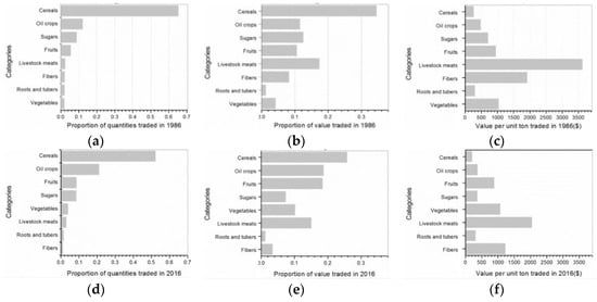 Structure of global agricultural trade in volume and value (a,b,d,e) and values per weight (c,f) in 1986 and 2016.