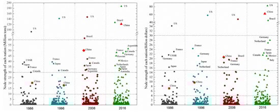 When all nations were sorted according to annual node strength, a hierarchical structure resembling a pyramid appeared from many small nodes to few large nodes (Figure 5). The position of each nation in the annual hierarchy shows its real trade ability, and the change in position of a nation between years shows the ability to change. Only a few nodes had high strength, but they played hub roles in the whole trade network. The US was always at the top of pyramids in both trade networks during 1986–2016, with several developed nations such as France, Germany, and Japan following. An interesting change is the emerging developing countries of China and Brazil rapidly moving toward the top of pyramids and becoming hub nodes second to the US in 2016.