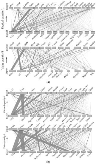Exporting was more concentrated than importing, and so we chose exporting countries that accounted for 70% of the total trade and importing countries that accounted for more than 80% of the total trade as target objects and directly expressed the trade relationships between these major economies (Figure 6a,b). The thickness of link lines in Figure 6a,b denotes the trade size between two countries. In 1986, the main trade products were cereals, soybeans, and sugar. The strongest link was US–Japan in the physical network, followed by Canada–USSR (former Union of Soviet Socialist Republics), France–USSR, France–Italy, and US–South Korea. In the value trade network, the strongest link was Cuba–USSR, followed by US–Japan, and France–Italy. Bulky trade occurred among developed countries as well as the USSR (Figure 6a).