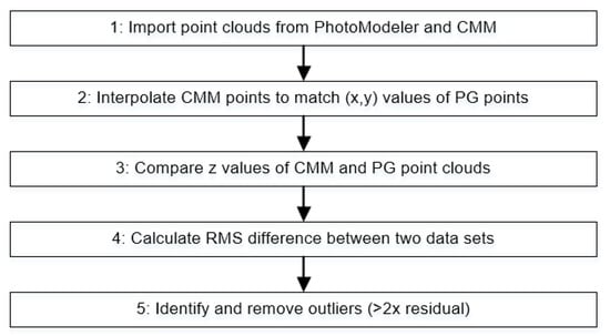 The photogrammetry and CMM results are compared against each other by using the generated error maps, which are averages over 10 repeats themselves. Due to the different positions and densities of measured points, each point cloud was interpolated to the same set of