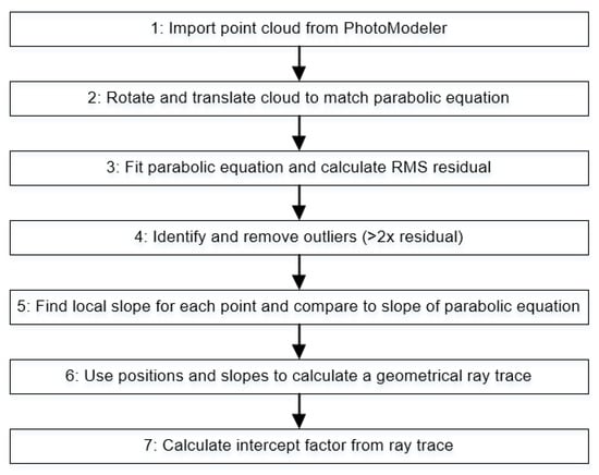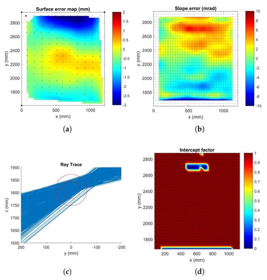 Between 20 and 30 photographs were then taken from different positions around the facets and processed using the PhotoModeler software. The point cloud was imported into MATLAB and the parabolic equation with a focal length F of was fitted. The surface error map for each measurement was calculated by comparing the actual point position to the ideal surface. The point cloud was then interpolated to a 35 × 35 point grid to calculate the slope at each point. This was compared to the slopes of the ideal surface, and slope error maps were determined. The slope was then used in a ray-tracing algorithm to predict the path of light reflecting from the mirror towards the receiver tube. The distance of closest approach between the reflected light ray and the center of the ideally placed receiver was calculated as the defocus distance. The intercept factor was determined by counting the percentage of light rays with a defocus distance greater than the radius of the inner receiver tube.