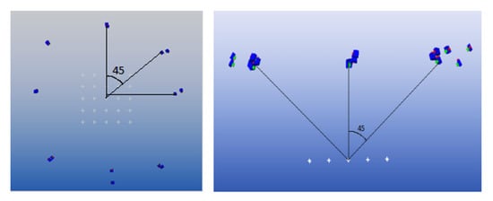 The photographs were taken so as to have the light rays connecting the camera and the points close to perpendicular. This is optimal for the intersection calculation within the software and so increases the accuracy of the points. To do this, the photographs were taken at an angle of approximately 45 degrees from the horizontal plane of the spheres and at eight positions equally spaced around the points, as seen in