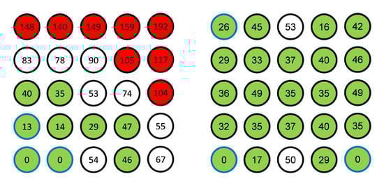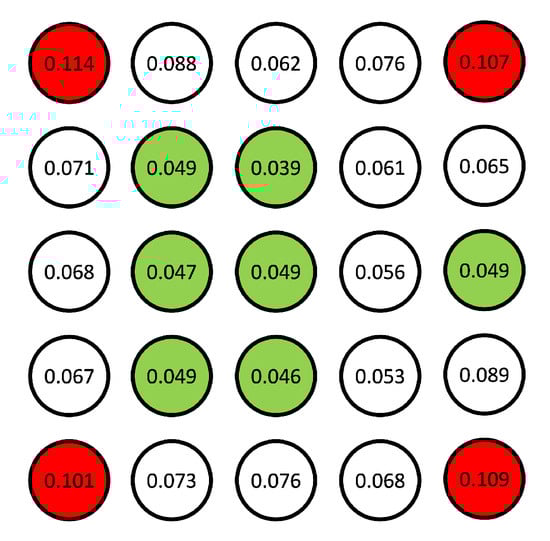 Figure 5. Each circle represents one of the spheres in its corresponding position in the 5 × 5 grid, contained within is the RMS residual in pixels. Highlighted in red are those spheres with residuals greater than 0.1 pixels and in green are those less than 0.05 pixels, showing the greater quality toward the center.