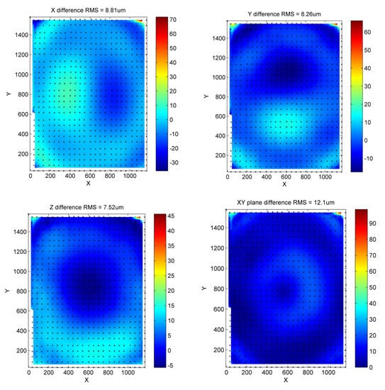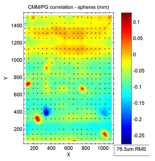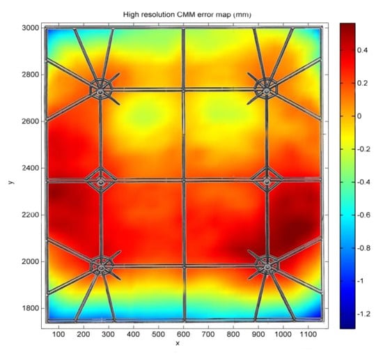 Figure 8 shows the high-resolution CMM error map, measured with a point spacing of 20 mm in