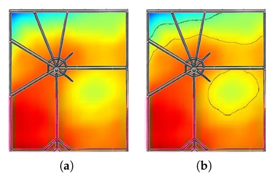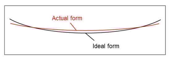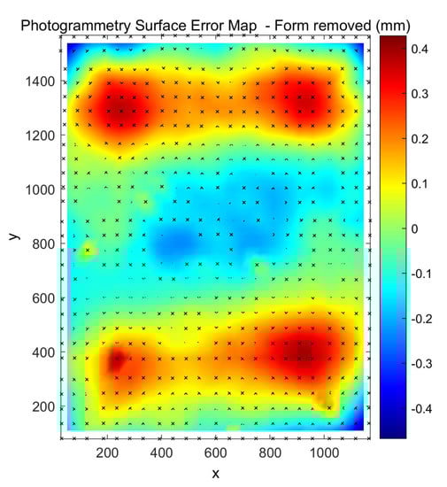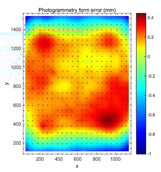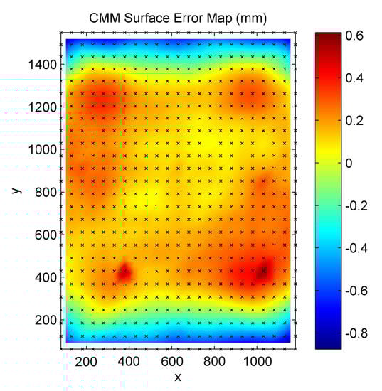 Figure 12 shows the error map produced from the averaging over the 8 CMM measurements calculated as the departure from the ideal parabolic equation. The map is formed from a 23 × 26 grid with 50 mm spacing in