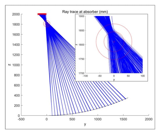 Figure 20. The inset figure details the absorber tube ideal location and shows both the inner steel and outer glass tubes. All the light rays appear to hit the steel tube, with a 100% intercept factor, but there is a clear difference in the focal position from the center of the tube.