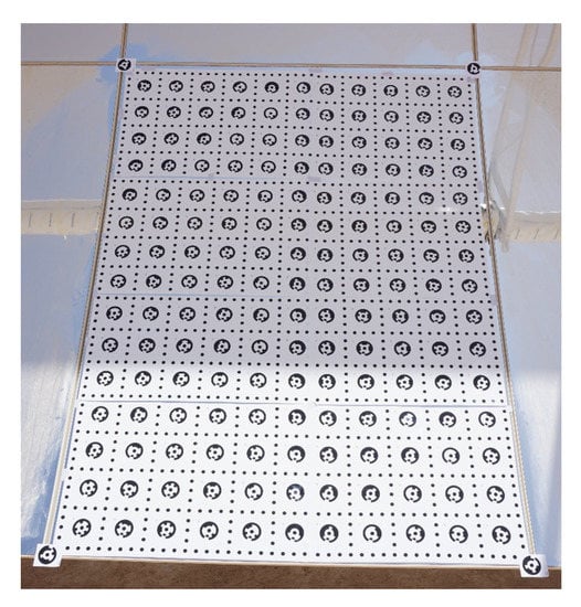 At each of these positions two photographs were taken, one with the camera held in a landscape orientation and the other rolled 90 degrees to portrait. This is an important step in the software camera calibration where lens distortions are calculated and corrected for. By implementing this camera roll, the accuracy was increased from 60 to 40 RMS.