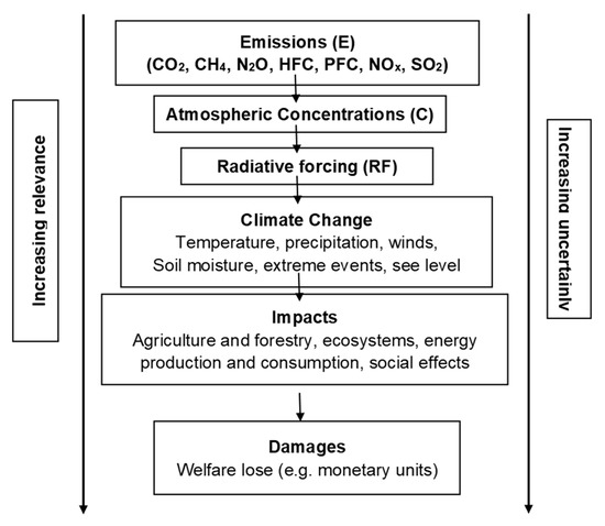 Transport accounts for 26% of greenhouse gas (GHG) emissions [52] about two-thirds of which originate in the wealthier 10% of countries [62]. The impacts on emissions from greenhouse gases, as well as emission mitigation and adjustment measures, can vary greatly depending on the particular transport mode which can also be classified as travel modes (land, air and water). With regard to transport, the three transport subsectors—passenger transport, freight and information—have different requirements for transport systems [63]. However, land-based transport systems are generally the most widely used in urban areas and can be split into traffic and road-based systems that are recognized as the major contributors to transport greenhouse gas emissions [52]. The OECD (2009) [64] states that road transport accounted for 84% of the CO2 emission of the transport industry and 21% of global CO2 emissions from energy. Oil is the predominant transport fuel source, representing 81% of the transport sector’s total energy use. This dependency on fossil fuels is one of the few industry sectors where emissions are still increasing in terms of transport contributing to greenhouse gasses [52]. Figure 1 presents analytical tools and metrics for quantifying the extent of climate change impacts (i.e., agriculture and forestry, ecosystems, energy production and consumption, social effects) due to a variety of source emissions (e.g., CO2, CH4, N2O, HFC, PFC, NOx, SO2). The metric should be simple to understand and scientifically sound, enabling a comparison of the differences in emissions and providing guidance on decisions on our future moves. When choosing a metric, it is important that it is closely linked to the impact of the concern (i.e., if climate stabilization is of our concern about a given temperature change, then the chosen metric should provide information on temperature change). Unfortunately, the impacts of and inherently damaging measures that are increasingly relevant to climate change are increasing insecurity (Figure 1).