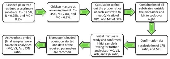 The primary substrate used in the study (as a carbon source) was palm tree residues. These residues were collected, at 9% MC, from Al-Deraya County in the Riyadh area, Saudi Arabia. The collected residues were crushed using a FYS-76-shredder (Mainland, Zhejiang, China). Grinding was accomplished to decrease the particle size of residues up to 1–2 cm to stimulate better aeration and MC uniform distribution and to enhance the microbial degradation process. Chicken manure was used as an amendment (i.e., the nearby available nitrogen source) to correct the C/N ratio. The chicken manure, at 6.2% MC, was collected from a broiler chicken farm in the Riyadh area. Calculations were made to create a compost mixture (i.e., crushed palm tree residues, chicken manure, and water) that has the optimum level of MC (60%) and a C/N ratio of 30:1; this was performed by solving Equations (4) and (5) simultaneously []. Figure 1 shows the procedure of the experimental steps including the design of the initial compost mixture.