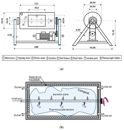 Four identical pilot-scale, rotary-drum bioreactors, each with a volume of 0.2 m3 (Figure 2a), were designed and constructed in the laboratory at the educational farm, Agricultural Engineering Department, King Saud University, (Riyadh, Saudi Arabia, 46°47′ E, longitude and 24°39′ N, latitude). To reduce the heat loss and enhance metabolic exothermic reactions, the outer surfaces of the bioreactors were insulated with glass wool (25 mm thick). Each bioreactor was rotated around its axis (i.e., fixed tube, 50 mm outer diameter) at 3 rpm. The fixed tube was used for aeration and to support the temperature sensors (Figure 2b). A detailed description of the bioreactors was reported in [,]. To optimize the efficient operational method for composting palm tree residues, one bioreactor was operated continuously (continuous aeration–rotation, D1), and three were operated for 20 min of aeration–rotation at 1, 2, and 3-hour intervals (D2, D3, and D4), respectively. A control unit was implemented in each bioreactor to adjust the on–off operation frequencies. A layout dimension for the constructed rotary-drum bioreactor, installed on steel-angle frames with the rotating system, is illustrated in Figure 2a (dimensions are in cm, not to scale).
