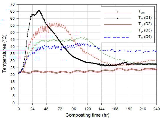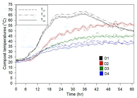 Composting is a chemical exothermic process which generates heat due to aerobic metabolic reactions in the composting materials. During the active phase of composting, the compost temperature (Tc), acid production, O2, CO2, pH, etc. are often used as indirect measures of microbial activities. In general, compost microorganisms grow within a wide range of pH (5–9); in this study, only the initial and final pH were measured on day 0 and day 9 (i.e., the end of active phase) and they were 7.3 and 8.8, respectively. However, the evolution of the compost temperature (Tc) as an overall and more representative indicator of microbial activities was monitored during the composting process. The generated heat increases the temperature of the composted material and bioreactor elements. Rotating bioreactors induce the mixing of compost materials and create, to some extent, nearly uniform temperatures within the composted mixture. Therefore, as illustrated in Figure 3, small differences (up to 3 °C, max) were recorded among the three temperatures of compost (Tc1, Tc2, and Tc3) measured in the four bioreactors (D1, D2, D3, and D4, Figure 3). In the discussion below, the mean value of the three compost temperatures (Tc1, Tc2, and Tc3) was used to represent the average compost temperature (Tc) in each bioreactor.