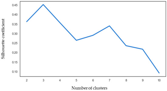 The SOM algorithm, proposed and developed by Kohonen [29,34], is an unsupervised neural network used to visualize and analyze high-dimensional data in the form of maps arranged in easy-to-understand low dimensional neurons. It consists of two layers of artificial neural networks; one is the input layer that receives input vectors and the other is the competitive layer comprising a two-dimensional grid. In this layer, vectors are clustered at one point according to the characteristics of the input vector. The input layer has the same number of neurons as the number of input variables, and the competitive layer has the same number of neurons as the number of clusters predetermined by the user. The data in the input layer are arranged in the competitive layer through learning, which is called a map. The sorted data is displayed as a grid on the map. Data with similar patterns are located close together on the map, while data with different patterns are located far away from each other. This allows us to easily visually assess not only similarities in the clusters but also similarities between the clusters. To determine the optimal number of clusters, we compared the silhouette coefficient with the number of clusters and conducted the analysis based on the number of clusters with the highest coefficient.