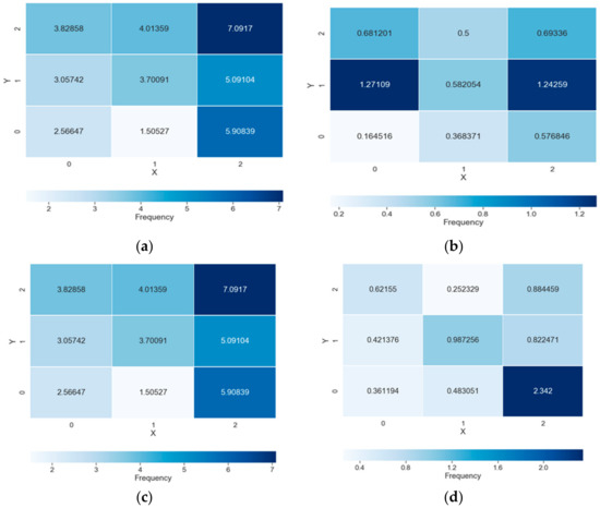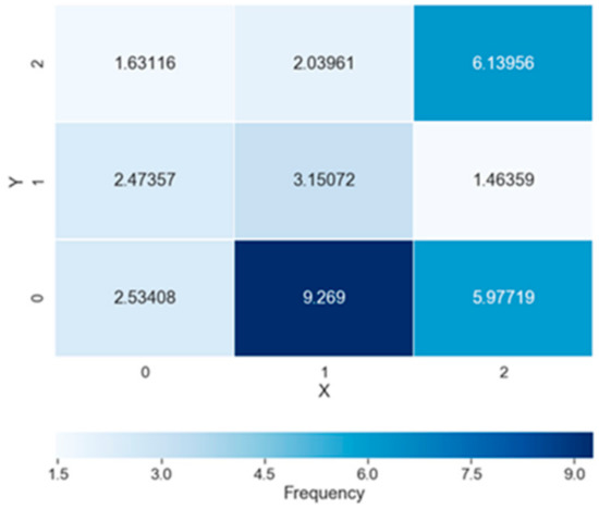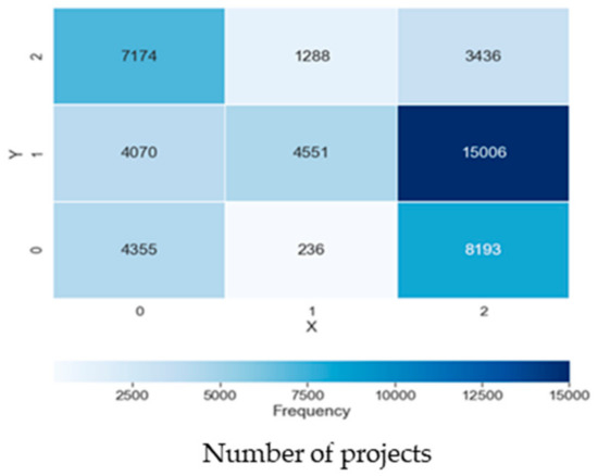 Figure 2 presents the results of the cluster analysis using 3 × 3 clusters, showing the distribution of observations across each cluster. Cluster 21 (C21) was the largest, with 15,006 projects, followed by C20 and C02, while C10 was found to be the smallest cluster. As the clustering results included no outlier clusters, we analyzed all the clusters to calculate the average governmental investment per R&D project, as shown in Figure 3, and the average number of projects in which R&D successfully led to commercialization. In the case of successfully commercialized projects, we examined the average number of commercialized projects, average commercialization period, average sales from commercialized projects, and average number of jobs created by commercialized projects (Figure 4).