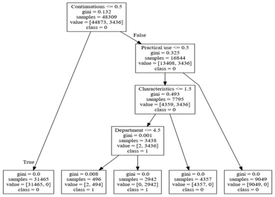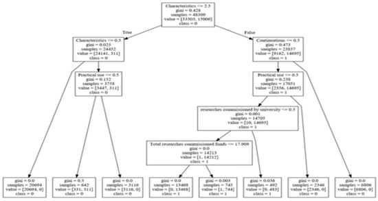 In the case of cluster C22, which demonstrated the strongest qualitative performance in terms of sales, new projects “not designated for practical use” with characteristics equal to “idea development” or “other development” had a 0.9994 probability of being in C22 (Figure 6). Among the projects in C21, which had a longer period to commercialization than C20 and C22 but yielded strong qualitative performance in terms of sales and job creation, new projects “not designated for practical use” with characteristics equal to “product or process development” had a 0.9993 probability of being in C21 (Figure 7). Among the projects in C01, which had a longer period to commercialization, as in the case of C21, but performed poorly in terms of sales and job creation, new projects designated for practical use with characteristics not equal to “other” had a 0.9801 probability of being in C01 (Figure 8).