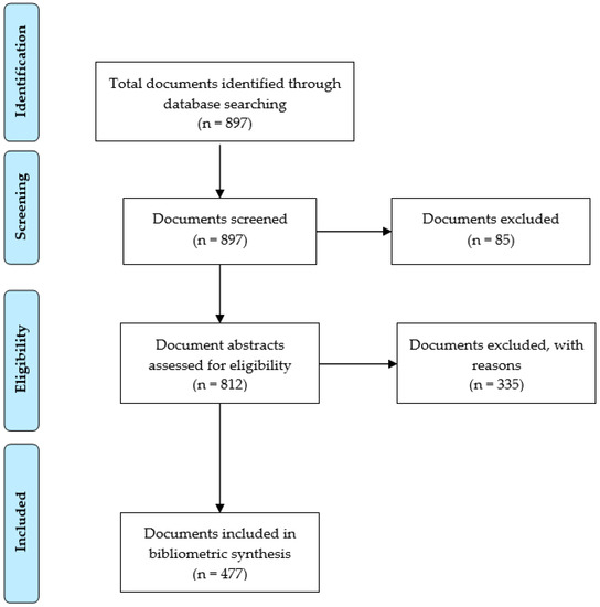 The review employed the Preferred Reporting Items for Systematic Reviews and Meta-Analyses (PRISMA) to guide the search for documents [38]. A keyword search was conducted in Scopus with the keywords ‘sustainability’ and ‘health care management’. This search yielded 897 documents. The elimination of unwanted types of documents (e.g., surveys, notes, letters) and documents lacking sufficient relevance led to the elimination of 420 documents (Figure 1). The final database consisted of 477 documents. It should be noted that Scopus keyword searches often yield a high percentage of excluded documents for interdisciplinary topics such as sustainable health care management.