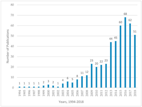 The first publication sourced for this review was published in 1994. However, scholarly interest in this field did not take off until 2009 when the year-on-year frequency of publications increased by 44%. In subsequent years up until the present, interest in this domain of sustainability research and practice increased significantly with over 90% of all publications appearing since 2009 and 70% since 2013 (Figure 2).
