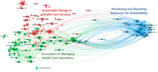 Author co-citation analysis map of the healthcare management for sustainability literature (threshold 15, display 131 authors, cluster resolution 90%, 3 clusters).