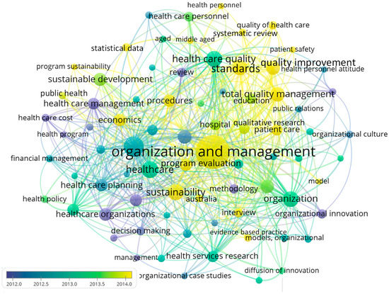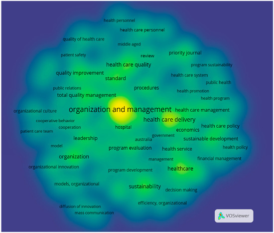 Co-word analysis was used to analyze the topics studied in the SHM literature. The first used VOSviewer to identify the most frequent keywords. As indicated in the density map (Figure 5), the most frequently occurring keywords were organization and management (261), health care delivery (119), healthcare (92), sustainability (86), health care quality (85), organization (81), standard (78), and total quality management (74). This pattern of results reinforces that findings from author co-citation analysis which highlighted the dominance of sustainability s viewed from an economic perspective.