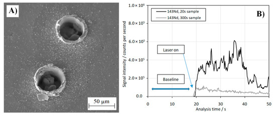 (A): SEM-secondary electron image of laser pits in matte phase. (B): Time-resolved analysis signals for neodymium (143Nd) of the LA-ICP-MS measurements on the copper sulfide mattes of samples contacted in air for 20 s and 300 s at 1300 °C.
