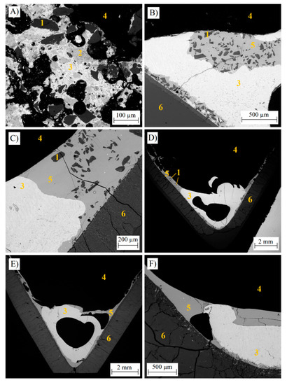 SEM-BSE images of sample microstructures after different contact times in air atmosphere. (A): 10 s, (B): 20 s, (C): 30 s, (D): 60 s, (E): 150 s, (F): 300 s. The numbers in figures A and C denote the different phases and parts of the samples—1: solid silica, 2: solid iron oxide, 3: copper sulfide matte, 4: epoxy, 5: liquid slag, 6: silica crucible.