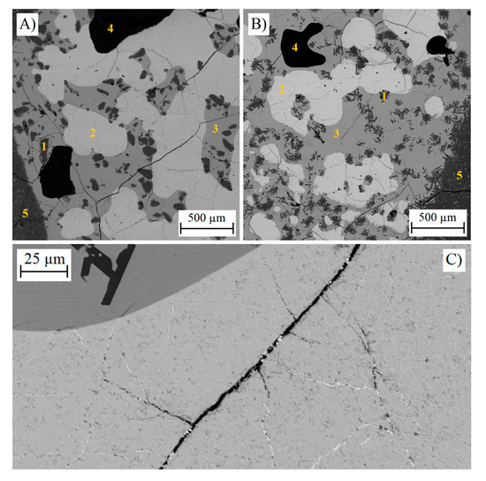 SEM-BSE images of samples reacted in argon atmosphere. (A): 5 min contact time, (B): 40 min, (C): copper-rich veins in the matte after 20 min. The microstructures remain relatively similar as the time is increased. The numbers denote 1: solid silica, 2: copper sulfide matte, 3: liquid slag, 4: epoxy, 5: silica crucible.