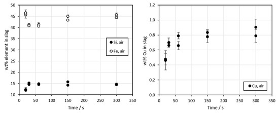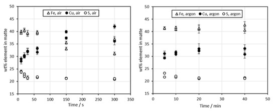 The concentrations of major elements in matte are shown in Figure 6. In air atmosphere, the concentration of copper increased to approximately 40 wt% after 300 s. Correspondingly, the concentration of iron decreased from 40 wt% to below 35 wt%. In the previous studies by Wan et al. [29] and Guntoro et al. [27], the copper grade increased significantly more with the same contact times. However, the concentrate used was different.