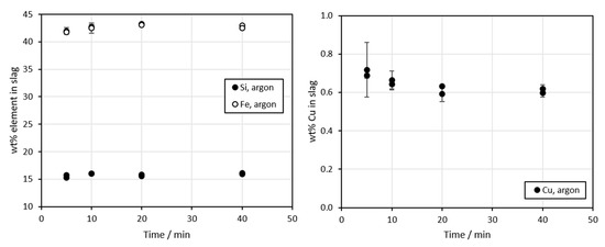 Figure 4 and Figure 5 show the concentrations of silicon, iron, and copper in molten slag as a function of contact time in air and argon atmospheres, respectively. It is evident that in air atmosphere, the concentrations of the major elements Fe and Si in the slag are changing until 150 s contact time, and become relatively stable after that. The copper concentration in the slag also seems to increase until 150 s time, and stabilizes after that. For the experiments conducted in inert argon atmosphere, the changes in composition were smaller. This was most likely due to the absence of free oxygen and longer contact times. The results presented in Figure 5 correspond to the microstructures shown in Figure 3; no major changes occurred as the contact time was increased.