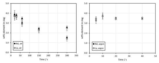 The concentrations of La and Nd in slag as a function of time are shown in Figure 7. It is evident from the results that the two REEs behave in the exact same manner, which confirms the thermodynamic calculations (available in Appendix B, Figure A1) regarding the stability of their oxides. In air atmosphere, the concentrations decreased as a function of time, which can be explained by the increasing slag volume as the time was increased (Figure 2B–F). However, for the argon experiments, the concentrations of REEs remain relatively stable, supporting the microstructural observations as well as the major element concentration results (Figure 5 and Figure 6 ).