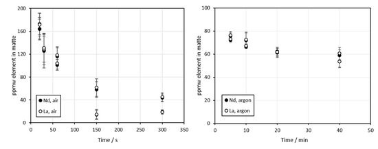 Figure 8 presents the concentrations of La and Nd in the copper sulfide matte as a function of time. The concentrations decreased from approximately 170 ppmw to around 35 ppmw as the time was increased from 20 to 300 s in air. In argon experiments, the decrease was less significant, and the final concentration after 300 s contact time was approximately double that in the air atmosphere.