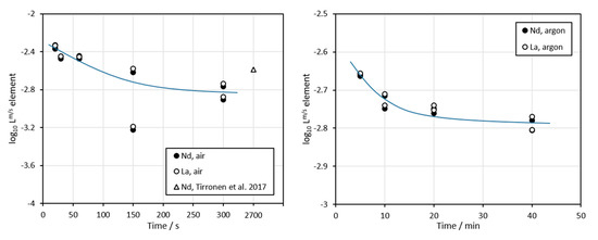 Distribution coefficients of La and Nd in air and argon atmospheres. The value from an equilibrium study by Tirronen et al. [23] (equilibration time 45 min = 2700 s) has been plotted for comparison.
