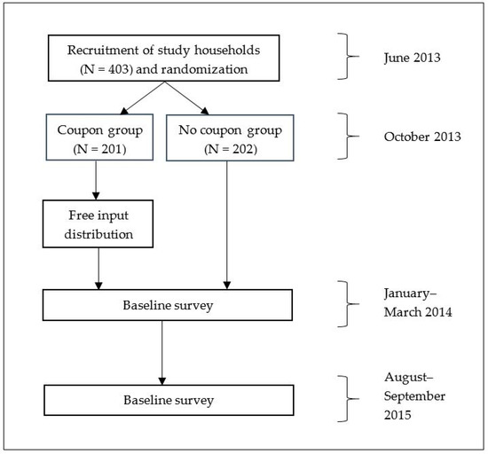 A baseline survey was conducted in January–March 2014 to collect detailed socioeconomic and agricultural data from the studied households. In August–September 2015, a follow-up survey was conducted to elicit WTP for the two inputs. The non-coupon farmers were presented with a short description of the technologies. The unique feature of our experiment was the random distribution of coupons for hybrid maize seed and fertilizer. We anticipated that the coupons would ease possible financial constraints farmers might have had by motivating them to use the technologies.