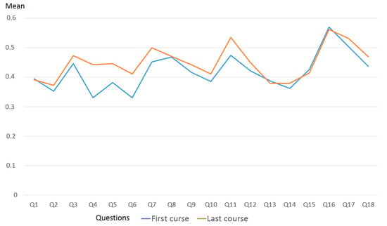 To visualize the results, the mean and median of the answers of each question are calculated, both in the first- and fourth-year answers. Figure 1 and Figure 2 show respectively the median and mean of the answers to the 18 questions of the survey. In both figures, the X-axis contains the 18 survey questions, and the Y-axis shows the value associated with the answers according to the conversion detailed in Section 2.4.1.