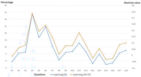 Unlike Figure 1, Figure 2 shows the improvement detected by the Mann-Whitney U test in questions Q4, Q5 and Q6. To visualize the improvement in the results of the fourth year with respect to those of the first year, Figure 3 presents the difference in absolute value (fourth year minus first year) for each question, and the relative percentage of improvement calculated as 100 * (fourth year - first year) / first year. The X-axis shows the 18 questions, the left Y-axis shows the percentage (corresponding to the blue line) and the right Y-axis shows the difference in absolute value (corresponding to the orange line). Since these are Likert variables, the improvement in absolute value is more clearly indicated than the improvement in percentage. However, the great similarity between the absolute value and the percentage value can be observed in the figure. The two lines show the improvements detected by the Mann-Whitman U test in questions Q4, Q5, Q6 and Q11, since in both lines these four questions obtain the highest improvement values.