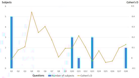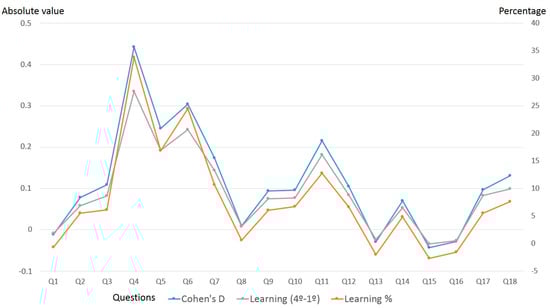 We now study graphically whether a relationship exists between the variables shown in Figure 3 and the size of the effect calculated by Cohen’s D. To this end, Figure 4 presents the improvement in percentage (orange line), the improvement in absolute value (gray line) and Cohen’s D (blue line) for each question. The Y-axis on the left corresponds to both Cohen’s D and the improvement in absolute value. The Y-axis on the right corresponds to the improvement in percentage. The 18 questions are shown on the X-axis.